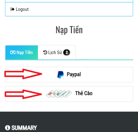 Bước 5: Có 2 phương thức nạp tiền dành cho bạn là Paypal hoặc thẻ cào. Ở đây mình chọn Thẻ Cào