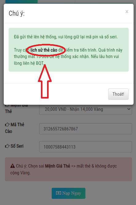 Bước 6: Chọn đúng mệnh giá thẻ, nhà mạng, mã thẻ cào, số serial. Rồi ấn vào [Nạp Ngay]. Nếu giao diện của bạn không giống như hình bên dưới, vui lòng chuyển sang trình duyệt Chrome.