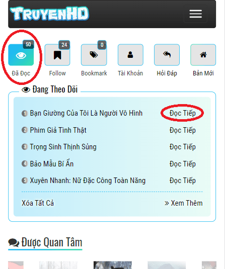 Bước 8: Để xem những truyện đã đọc vui lòng quay về trang chủ >> [Đã Đọc]. Vào chương bạn cần mua và [Xem Chương]